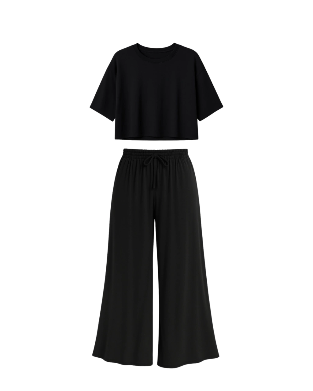 Versátil, leve e com toque super macio, esse conjunto em viscolycra é a escolha ideal para quem busca praticidade sem abrir mão de estilo. A blusa cropped com modelagem ampla combina perfeitamente com a calça pantalona de cintura alta, cós com elástico e ajuste em amarração.